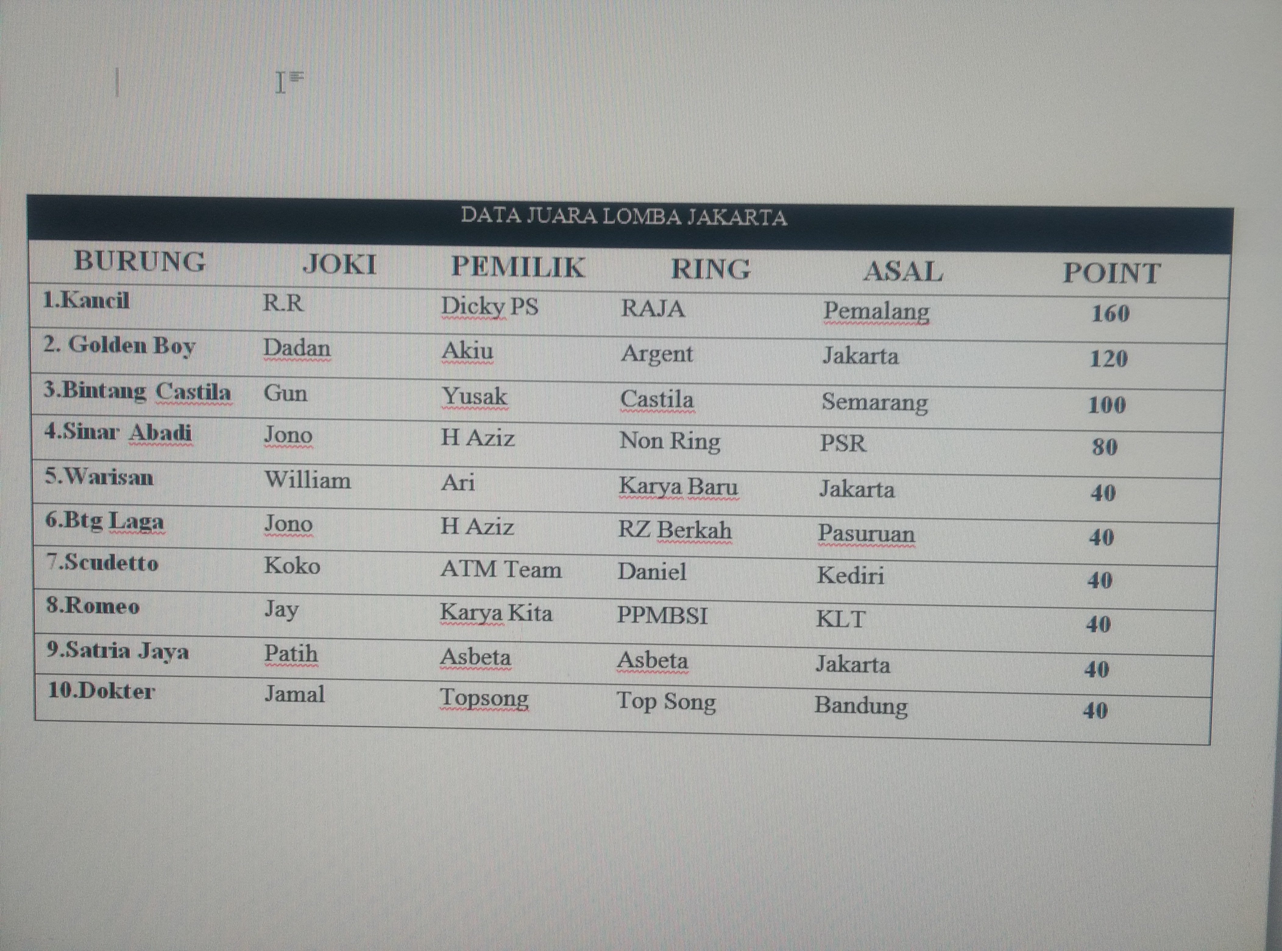 1 from Dan burungnya sudah di borongkan ke beberapa peternak. Tapi blog ini tetap ada karena dirasakan pengunjungnya banyak.mudah2an isi blog ini bisa menjadi tambahan pengetahuan bagi para pemula tentang merpati balap. Sejak agustus 2015, tdr bf resmi bubar, dan kami tidak melatih dan beternak burung merpati lagi. Daftar juara latpres new lenggang jakarta enterprtise (27/06) no nama burung nama pemilik alamat cucak ijo pembuka 1 nn jalu cij jak pus 2 alexine muhadi bonklap 3 minak jinggo fredick semper 4 hoky dedy sf melehoy bc 5 nn nn nn 6 random sakti abibia ngaceng sf 7 kurawa deni militan 8 boy. Sekian informasi burung legendaris merpati kolong juara nasional seputar karakter makhluk hidup yang kami hadirkan untuk anda. Semoga rekan rekan penggemar merpati kolong di yogyakarta jawa tengah dan sekitarnya tetap antusias dan berminat mengikuti lomba. Jenis merpati balap tercepat yang memang memiliki kualitas terbang paling cepat dari jenis burung lainnya dia merupakan sosok burung merpati balap juara nasional 2018 dan berasal dari kota bandung dengan nama sebutan atau nama brand jaya baya yang di miliki oleh salahsatu konglomerat yang memang sangat hobi sekali bermain burung merpati , orang. Harus terbang sendiri, kalau burung lawan berhasil gandeng, khayana pasti kalah, kalau pelepas berhasil melempar mentang, pasti khayana akan terbang sendiri, sprint dari start sampai ke betina dengan kecepatan di…